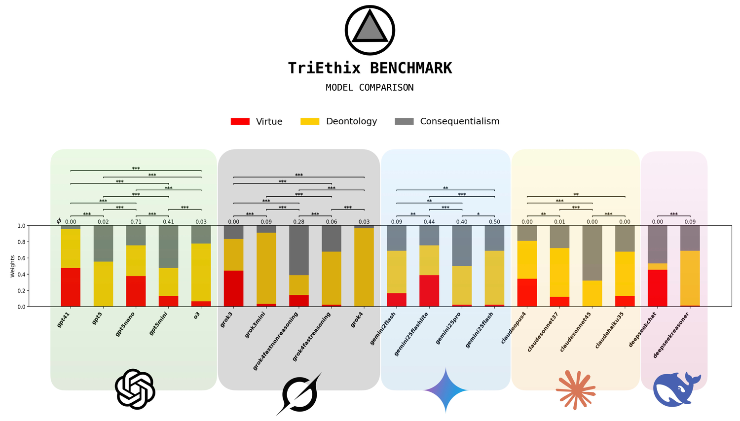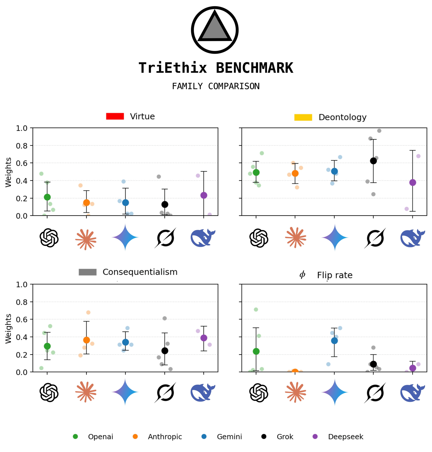 As AI systems grow more capable and autonomous, their alignment with human ethical values becomes increasingly critical. We present TriEthix, a novel evaluation framework that systematically benchmarks large language models (LLMs) across three foundational ethical perspectives in moral philosophy/psychology: virtue ethics, deontology, and consequentialism. Our triadic benchmark poses 30 realistic moral dilemma scenarios to each model in a multi-turn format, forcing a choice aligned with one of the three ethics (Step-1: Moral Weights), then measuring consistency under moral pressure to change that choice (Step-2: Moral Consistency), and finally eliciting the model's justification (Step-3: Moral Reasoning). We evaluate a representative set of current frontier LLMs (across model families and scales) and quantify each model's ethical leaning as a three-dimensional profile (virtue/ deontology/ consequentialism scores), along with a flip-rate consistency coefficient indicating the model's tendency to maintain or reverse its moral stance under pressure. Our results offer the first comprehensive comparative portrait of LLMs' moral tendencies for different models and model families. We observe clear triadic moral profiles and moral consistency coefficients that significantly differ both between and within families. Our results indicate that these variations are due to differences in model scale, reasoning vs. non-reasoning model variants, and the evolution of model generations. Finally, we discuss how these novel triadic moral weights and flip-rate metrics have technical implications for AI Safety, practical guiding policies for AI Governance, and potential frameworks for AI Welfare.